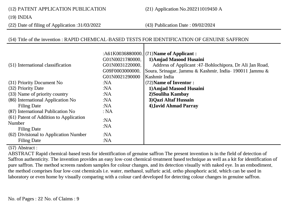Direct Analysis Saffron Chemical Test (DASCT): A Low-Cost and Rapid Authentication Method for Detecting Fake Saffron Read More RAPID CHEMICAL-BASED TESTS FOR IDENTIFICATION OF GENUINE SAFFRON Read More High-Efficiency 3-Step Protocol for Commercial Micropropagation of Gladiolus ‘Red Majesty’ Read More First report on the development of tissue culture protocol and presence of proteoid roots in the heritage tree of Kashmir “Chinar” (Platanus orientalis). Read More First report on novel fluorescent probes and their multiplexing for easy detection of multiple target active proteases Read More Saffron Tissue Culture Manual Read More Patent- AI-based method for detection of fake saffron Read More Saffron Tissue culture Read More Microbial Consortium For Organic Saffron Module Read More Foldscope based method for detection of fake saffron Read More AI-based method for detection of fake saffron Read More